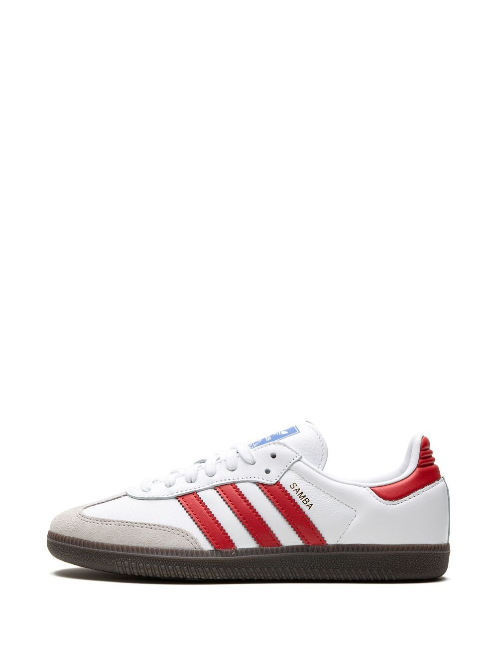 The adidas Samba OG White Better Scarlet is a modern remake of the original adidas Samba that was first released in 1949. This model is primarily a bright white color and features pops of scarlet red.