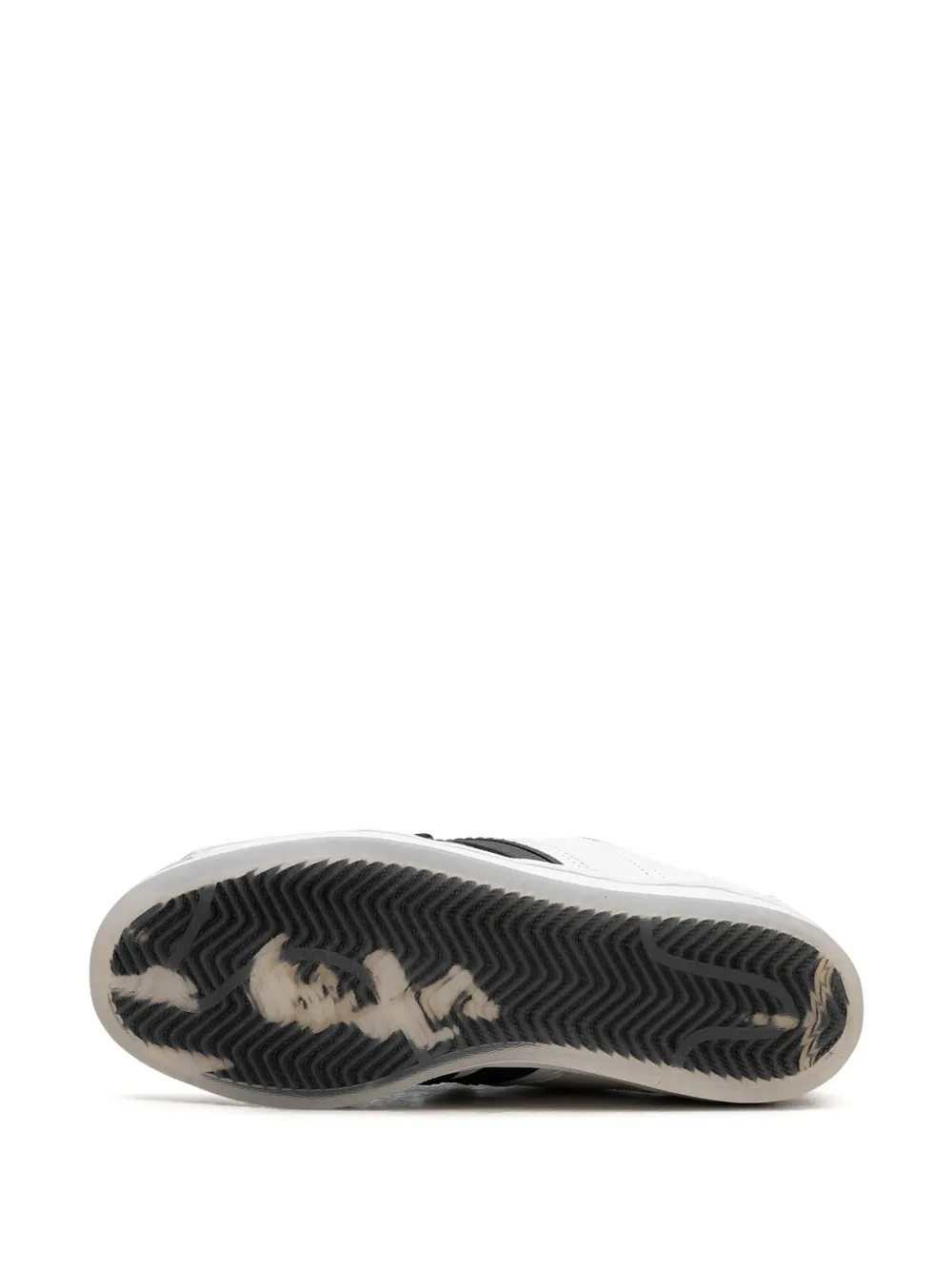 The KoRn x adidas Supermodified sports an upper of white calf leather. The texture of the leather along the side panel is tumbled, while it is embossed with a crosshatch pattern on the toe box, and pebbled between the black three stripes as well as on the tongue. The laces are also black, as is the sock liner. The white foam midsole with tonal stitching rests on an outsole composed of black and translucent gray rubber.