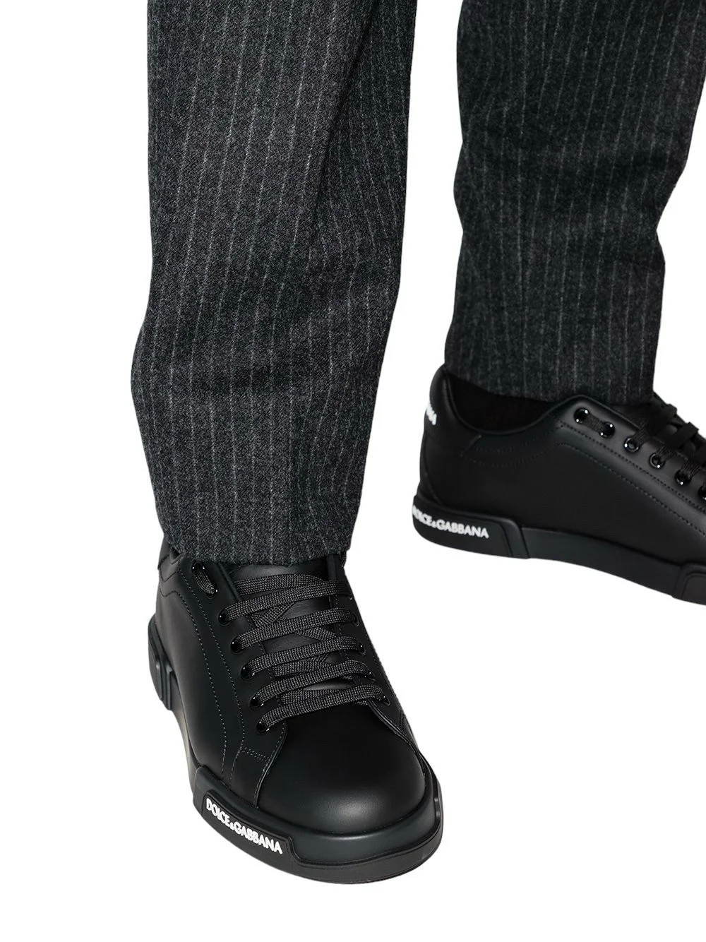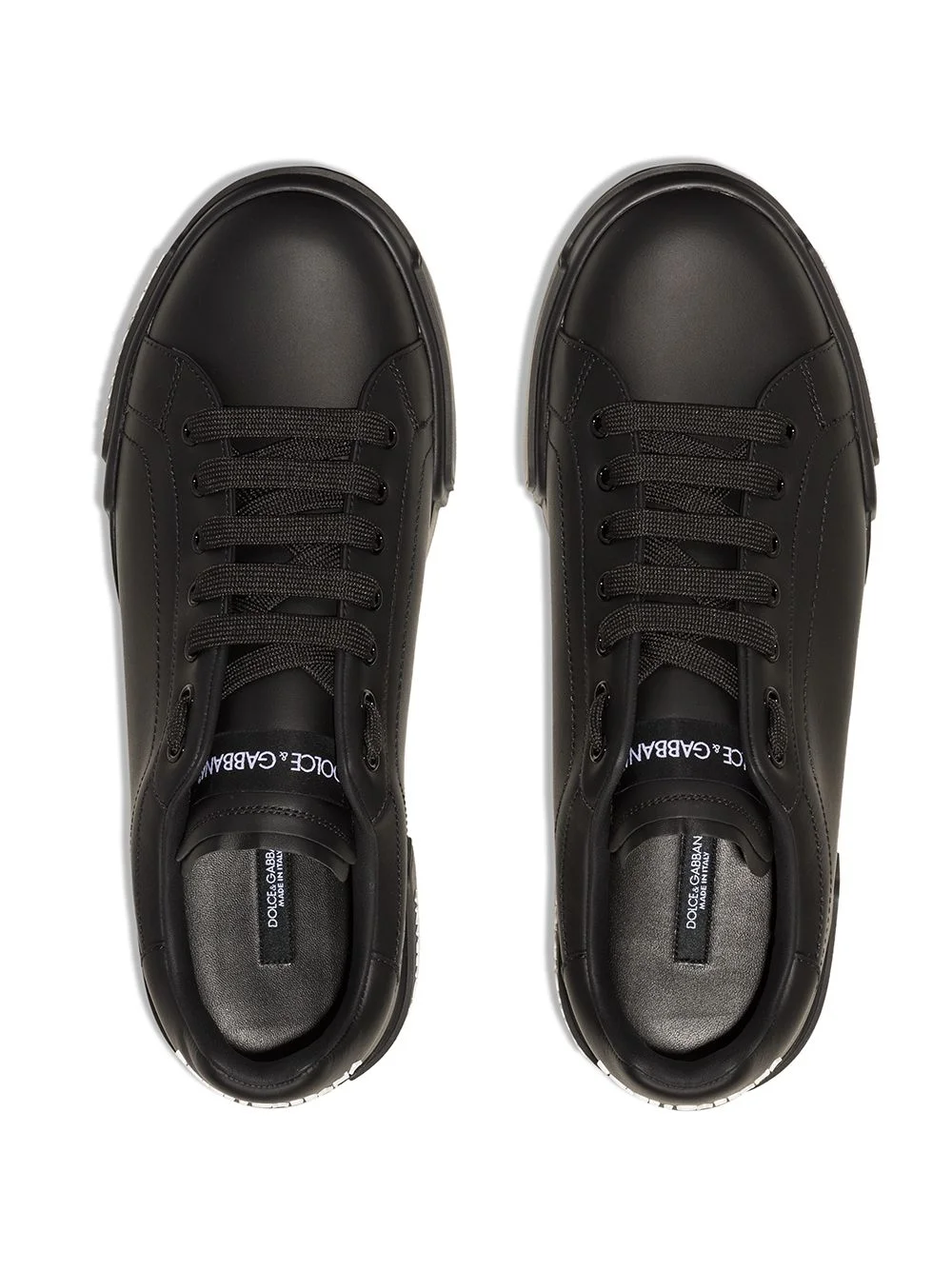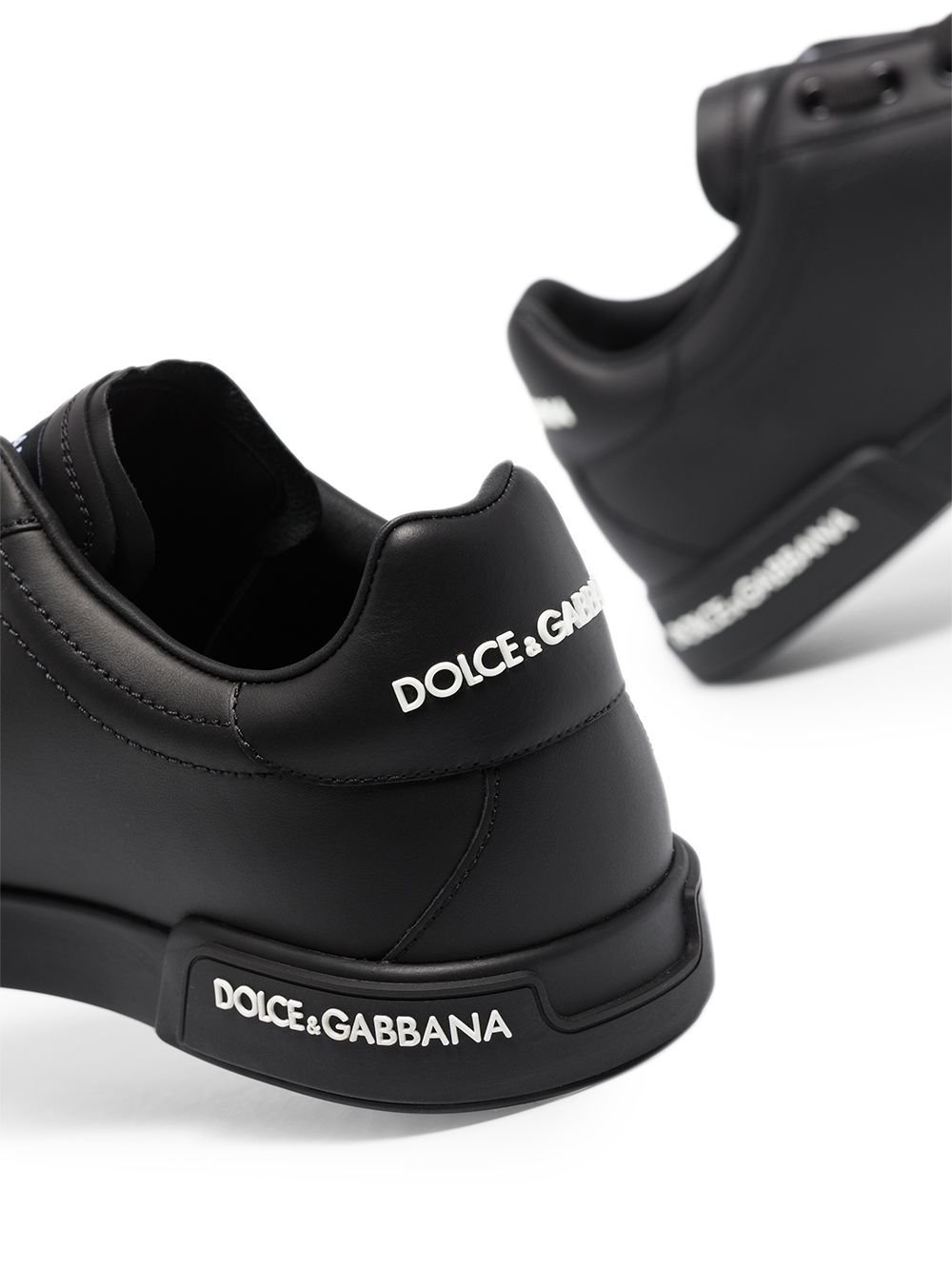 Who said that sneakers were only meant for the scruffy? These black leather classic portofino sneakers from Dolce & Gabbana are elegant and striking with a contrasting white logo print that shimmers with every step that you take. Go ahead and put your most stylish foot forward.