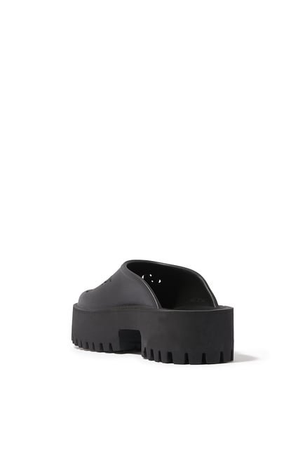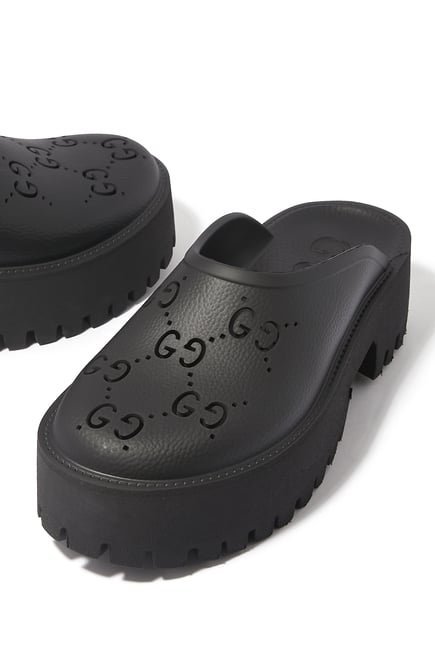ucci loves to debut new twists on its most iconic designs. Now, it’s time for an update on the beloved rubber sandals. These shoes are inspired by clogs with their closed-toe, slip-on design. A chunky, lug platform sole and block heel update the classic silhouette, along with a perforated monogram.