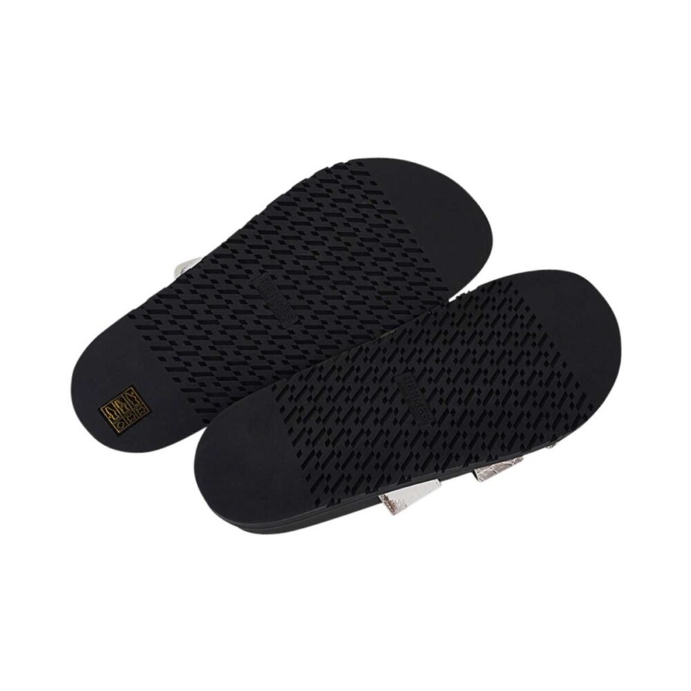 The wide exotic leather strap features an adjustable Velcro closure, creating a perfect blend of functionality and sophistication. This unique silhouette reimagines casual footwear as a luxury statement.