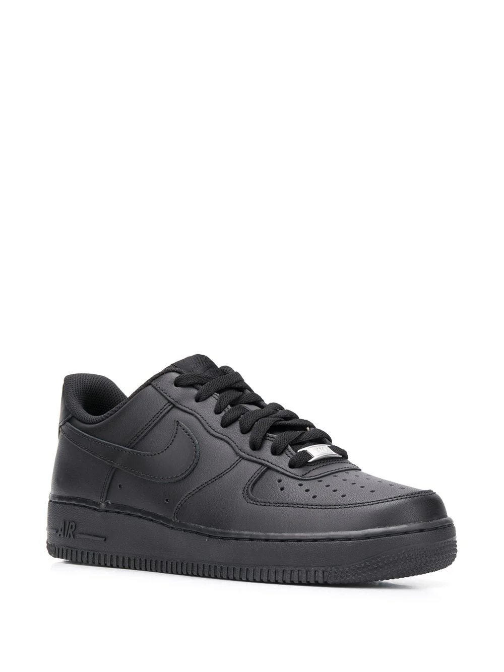 The Nike Air Force 1 Low ’07 Black features a triple black smooth leather upper with a matching Air sole and laces. Subtle Nike Air embroidery on the heel tab nods to the history of the AF-1 line. A metallic lace tag and woven tongue label complete the design.