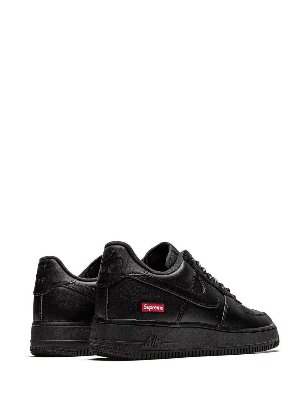 This Air Force 1 Low is comprised of an all-black leather upper with matching soles and detailing. A red Supreme Box Logo placed on the outside heel completes the design